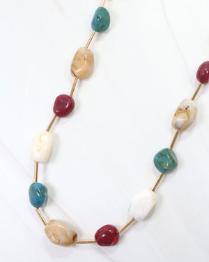 The Burbank Stone Necklace in Natural Multi features an array of earthy-toned stones that create a chic, versatile accessory. This fashionable necklace brings natural beauty and subtle color variations to your look, perfect for adding effortless elegance to any outfit.