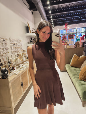 DOORBUSTER! Pleated Mock Neck Mini Dress in Brown