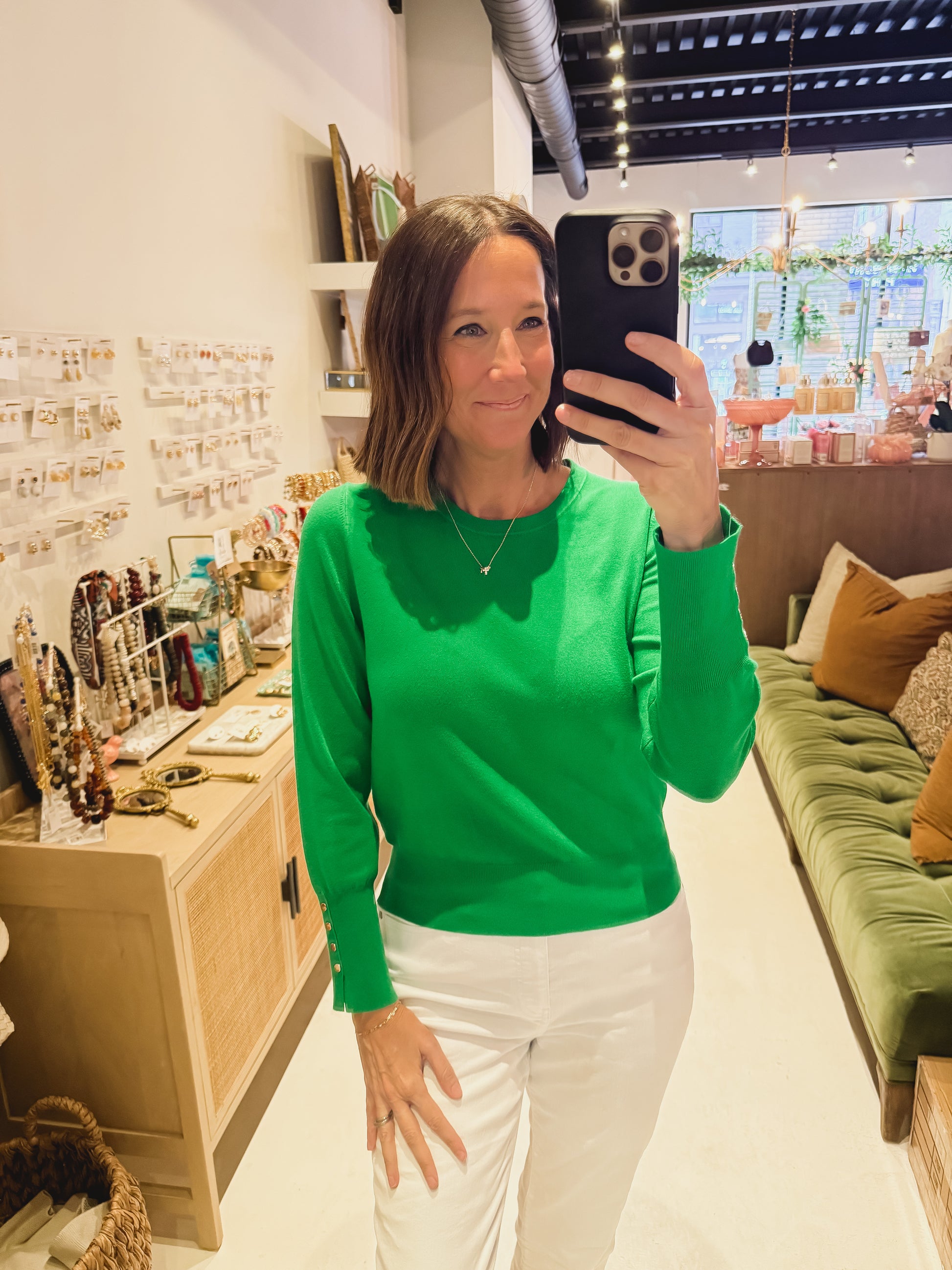 Introducing the Kelly Green Gold Button Sleeve Top. This solid round neck long sleeve top is perfect for transitioning into spring. Featuring pretty gold button details at the cuffs, this lightweight, non-sheer top pairs with blue jeans for a casual look or skirts and white pants for a dressier outfit.