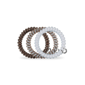 Truly Taupe Small Hair Ties in Blue and Taupe offer a strong grip without damage, doubling as a chic wrist accessory when not in use. Your new favorite hair essentials all year round.