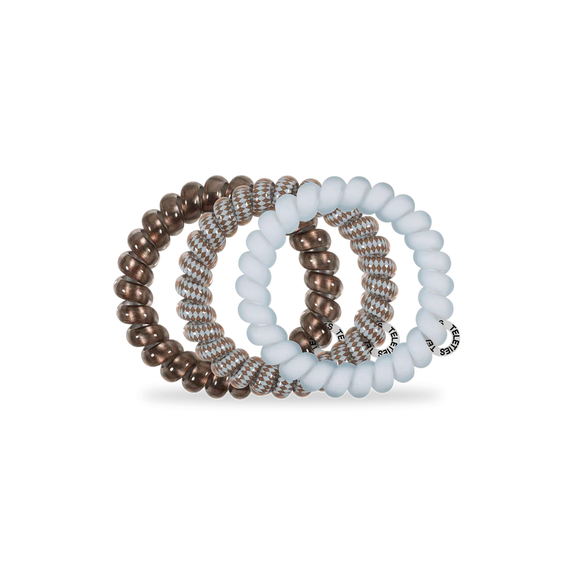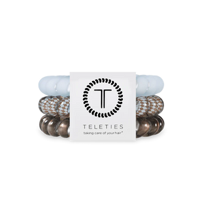 Truly Taupe Hair Ties in Blue and Taupe offer a strong grip without damage, doubling as a chic wrist accessory when not in use. Your new favorite hair essentials all year round.